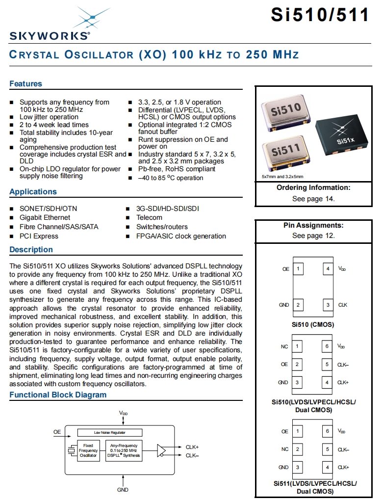| 511BBA125M000AAG | Skyworks | Si511 | XO | 125 MHz | LVDS | 3.3V | ±25ppm |